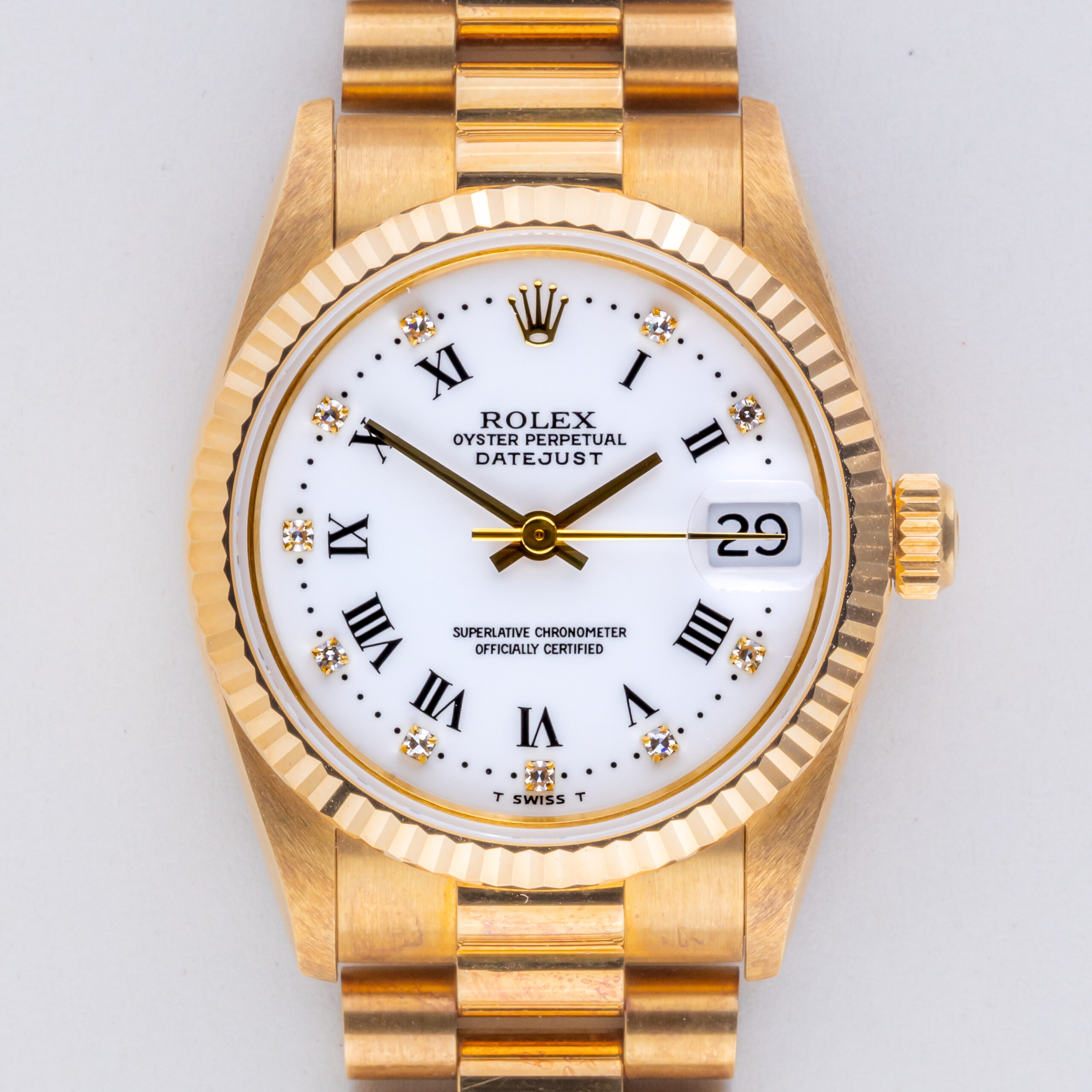 Rolex Lady-Datejust reference 68278 from 1995 including full set. The Lady-Datejust 68278 measures a 31mm gold case (18kt), a gold President bracelet and fluted 18k gold bezel. The Lady-Datejust 68278 features an automatic movement caliber 2135 with quickset date function, sapphire crystal and a white dial with diamond index. This Lady-Datejust is in unpolished condition.