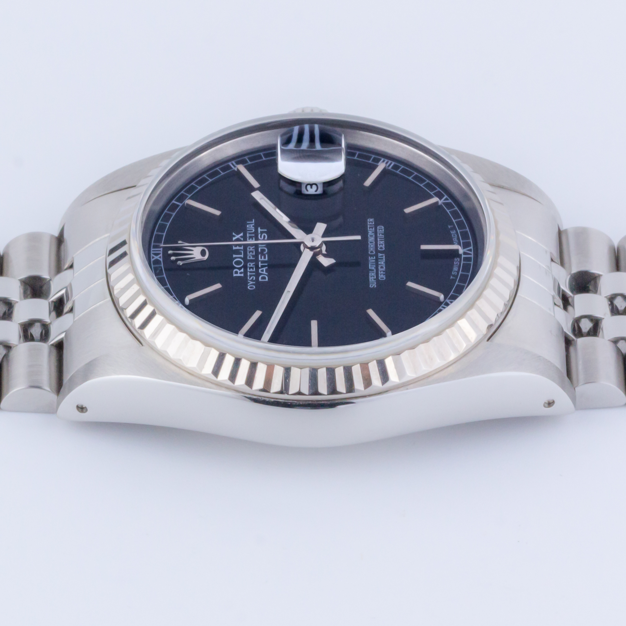 Rolex Oyster Perpetual Datejust reference 16234 from 1989 including full set. The Datejust 16234 Datejust measures a 36mm stainless steel case, a stainless steel Jubilee bracelet and a fluted 18k white gold bezel. This Datejust 16234 features an automatic movement caliber 3135 with quickset date function, a scratch resistance sapphire crystal and a black dial with tritium hands.