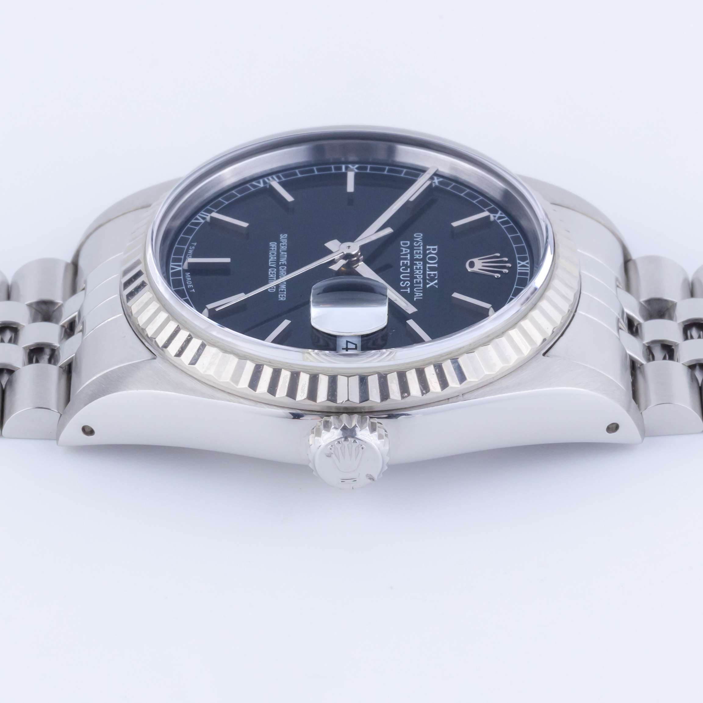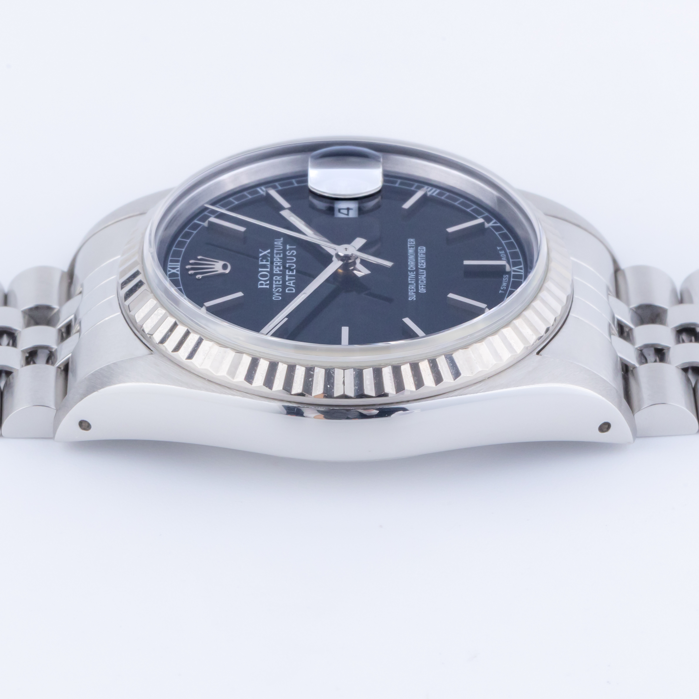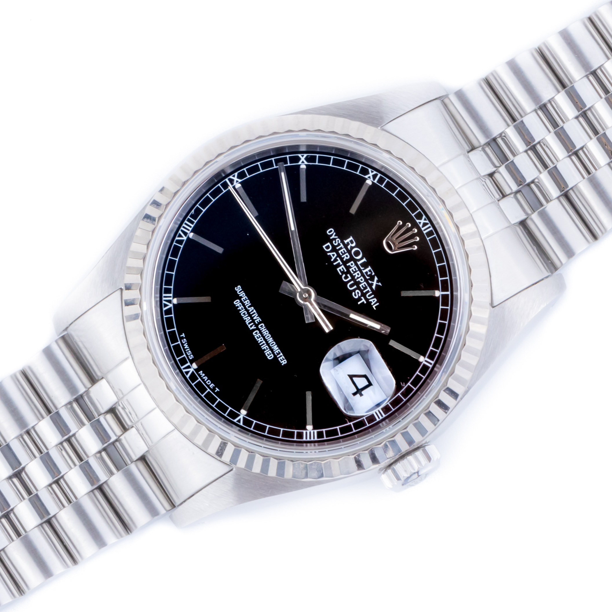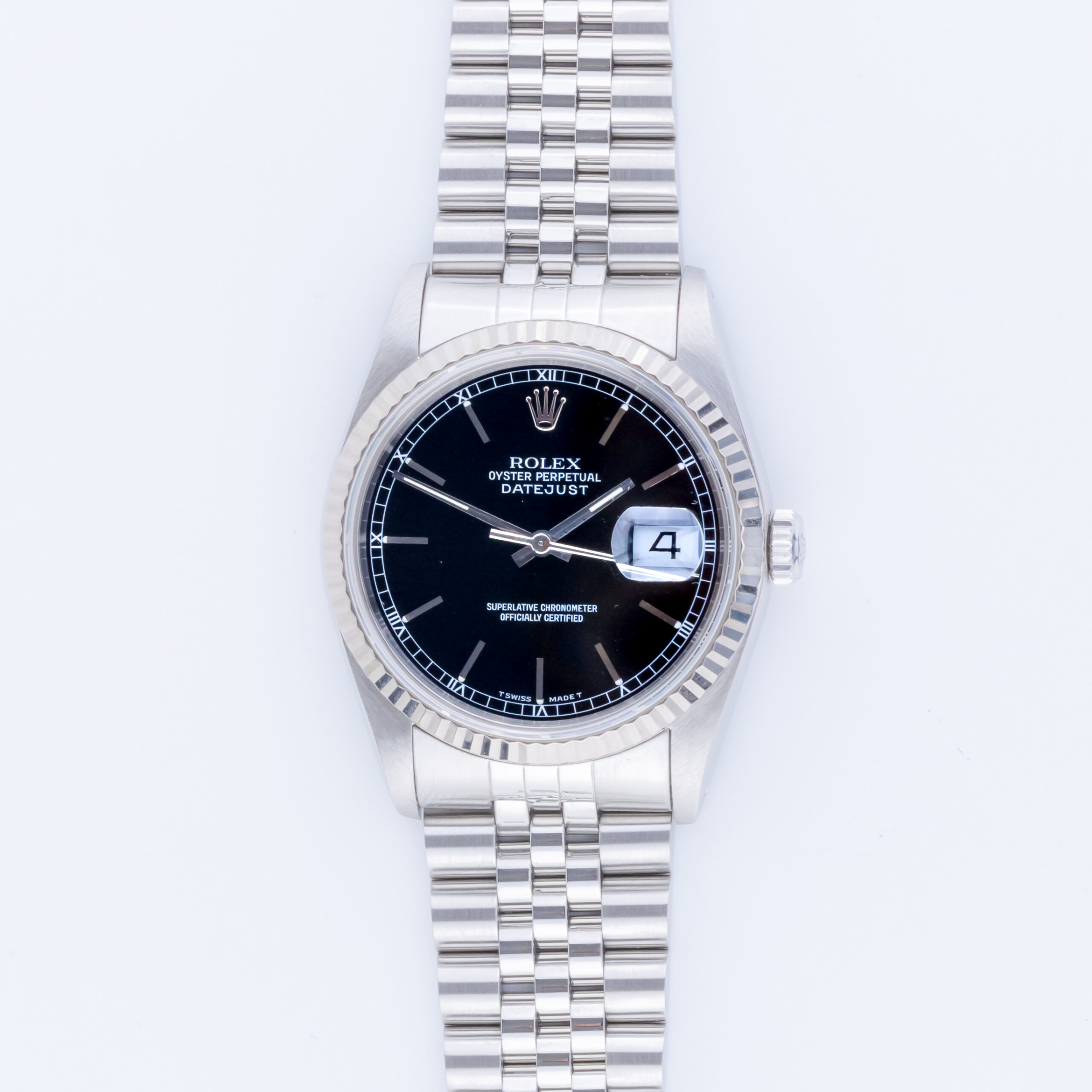 Rolex Oyster Perpetual Datejust reference 16234 from 1993. The Datejust 16234 Datejust measures a 36mm stainless steel case, a stainless steel Jubilee bracelet and a fluted 18k white gold bezel. This Datejust 16234 features an automatic movement caliber 3135 with quickset date function, a scratch resistance sapphire crystal and a black dial.