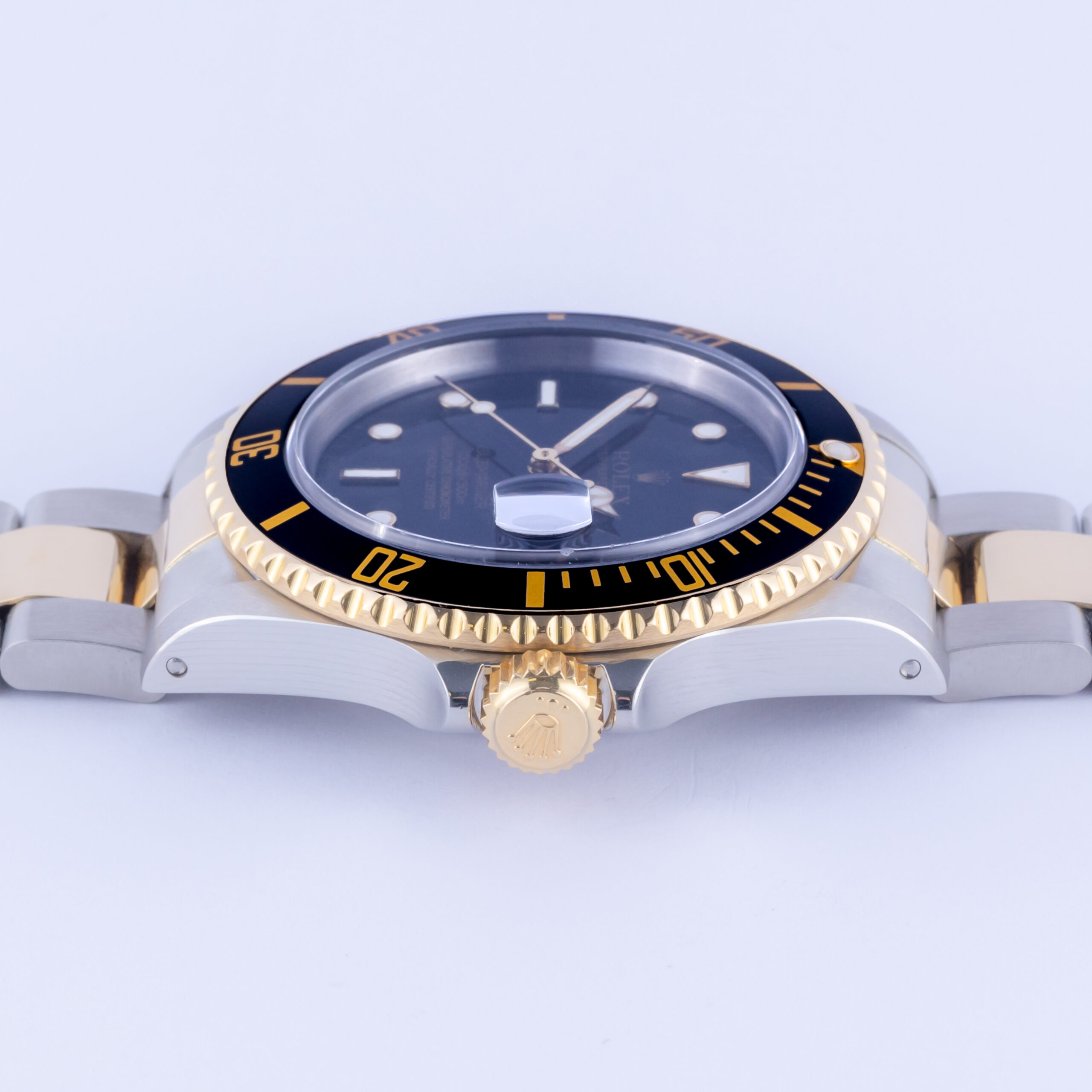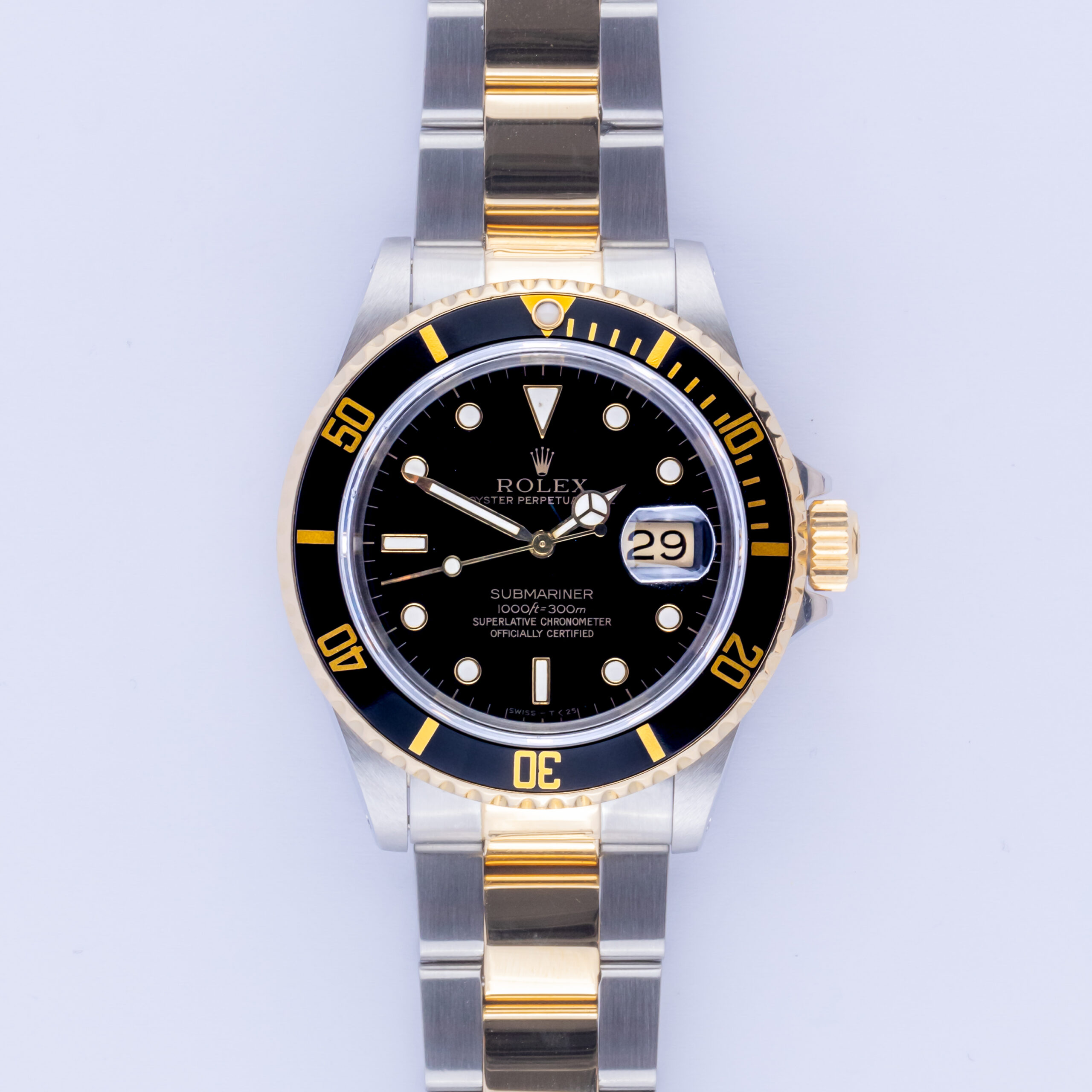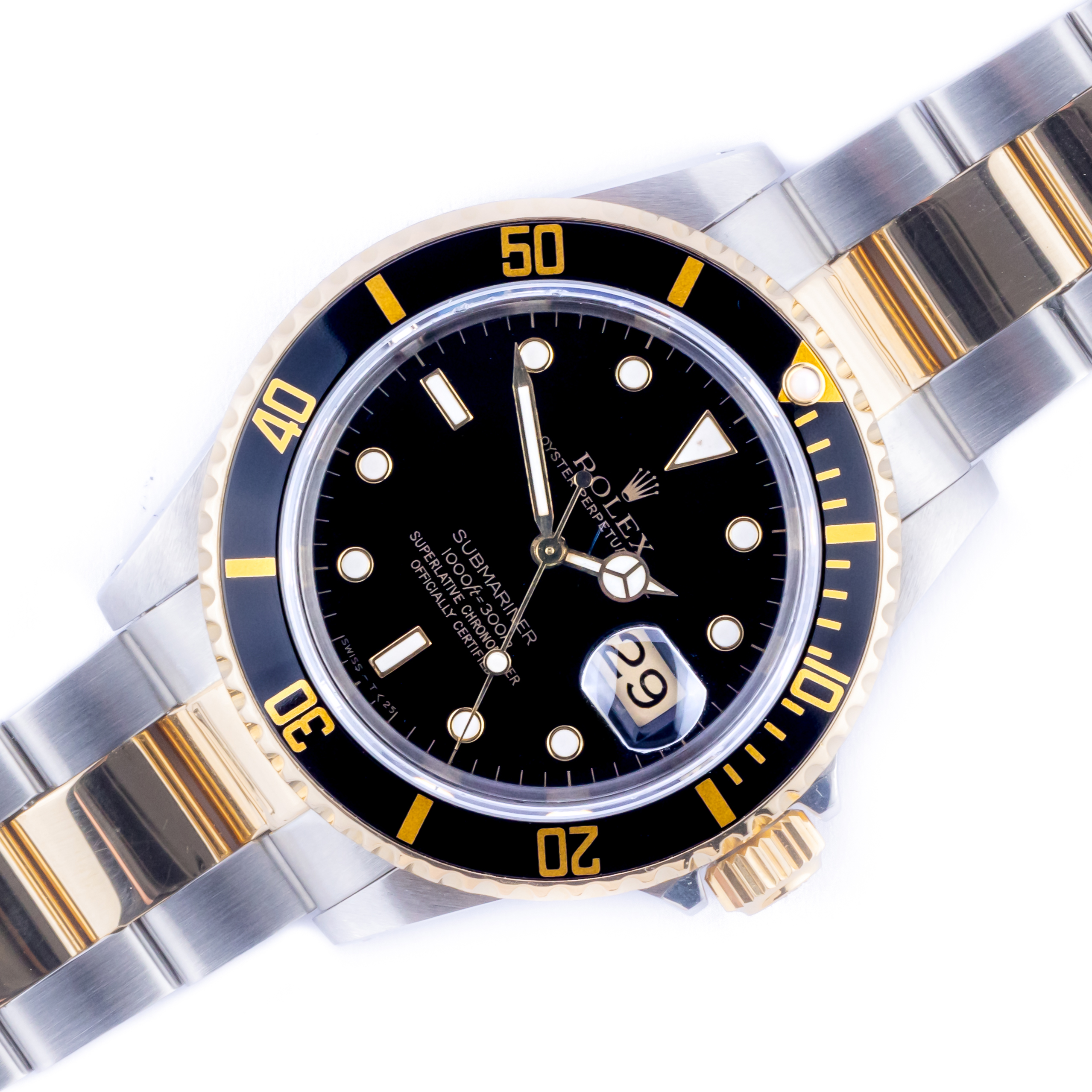 Rolex Oyster Perpetual Submariner Date Reference 16613 from 1989 including full set. The Submariner 16613 measures a 40mm stainless steel/gold case, a stainless steel/gold Oyster bracelet w/ Fliplock clasp and black rotatable bezel. The Submariner 16613 features an automatic caliber 3135 with quickset date function, a scratch resistance sapphire crystal and black dial with tritium hands.