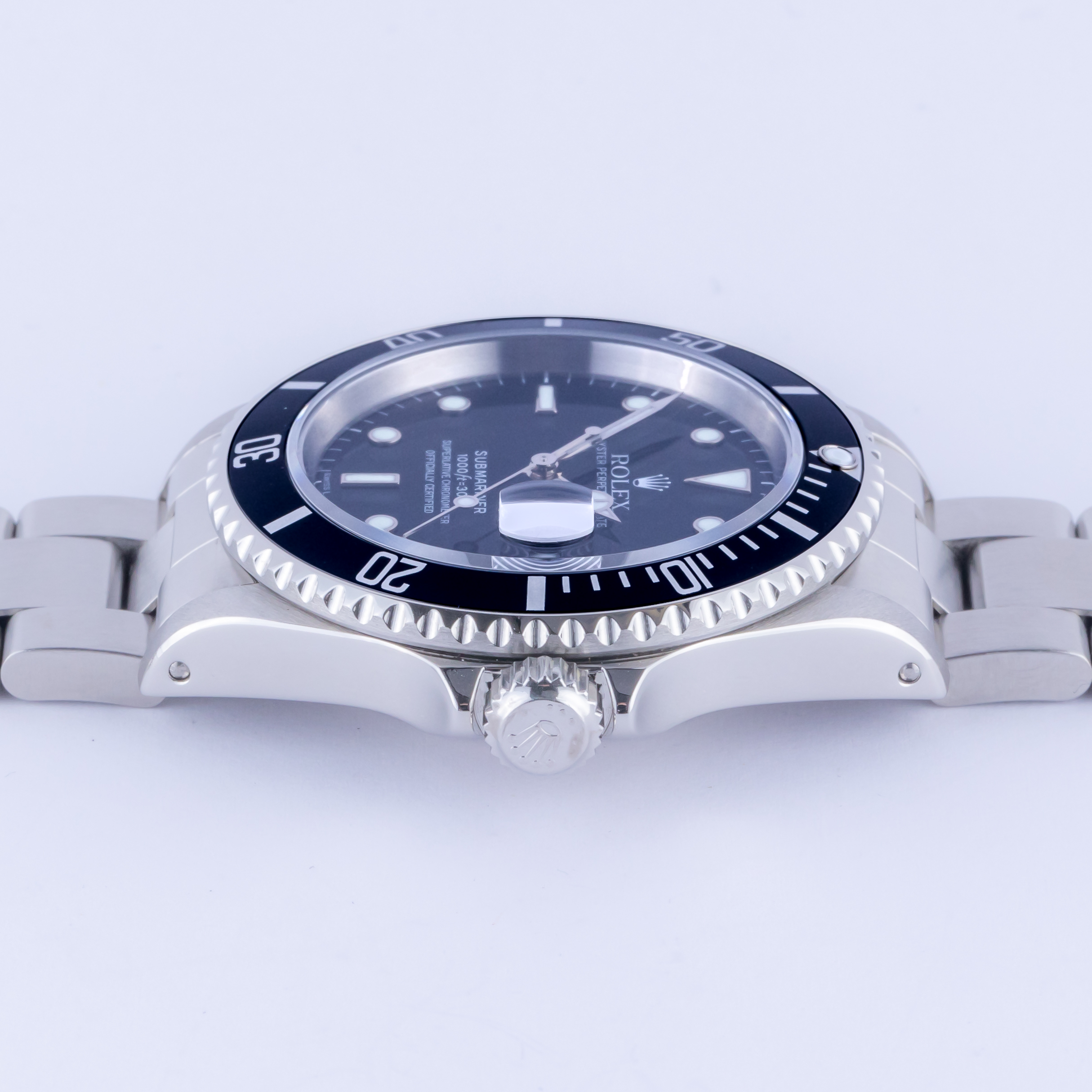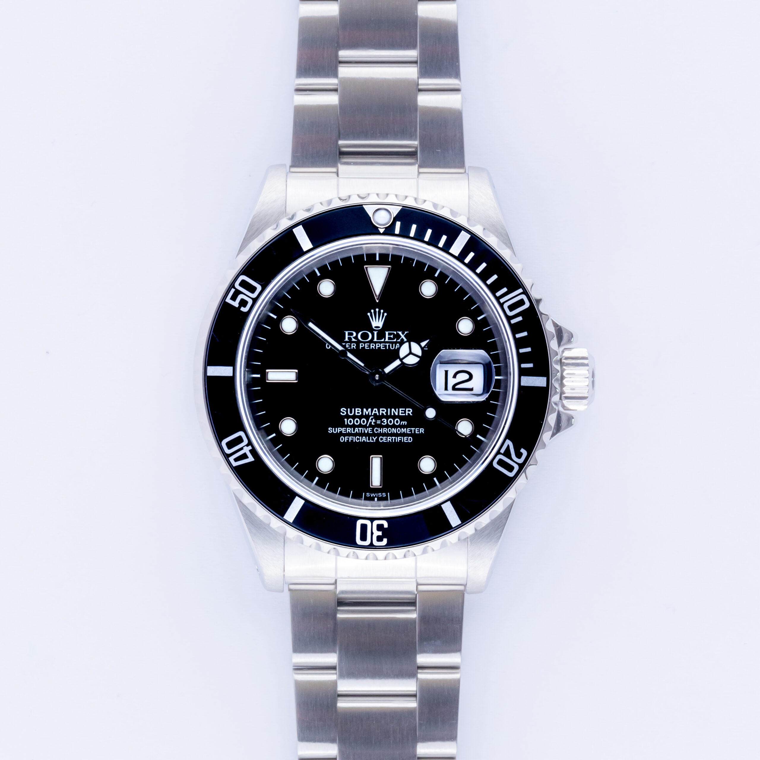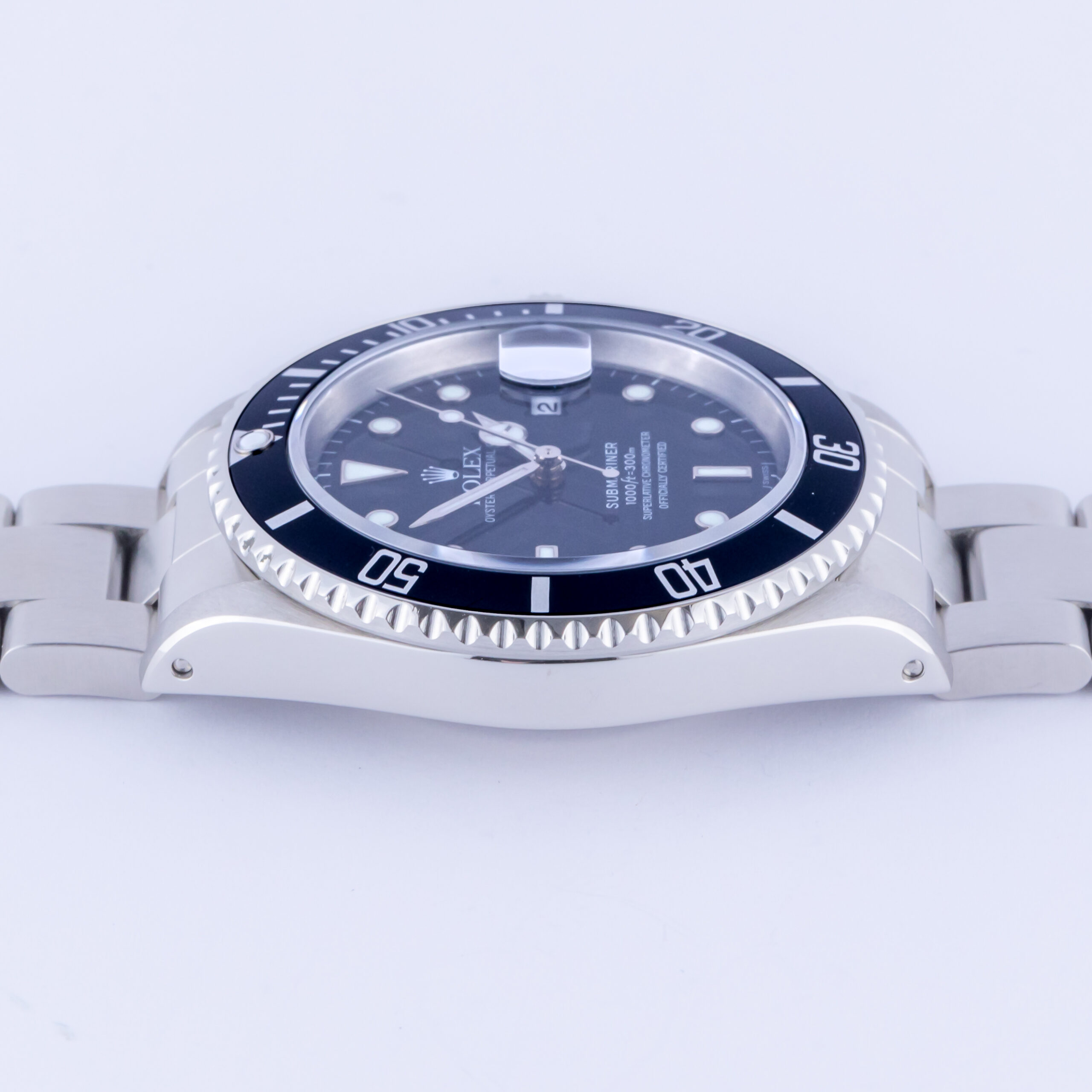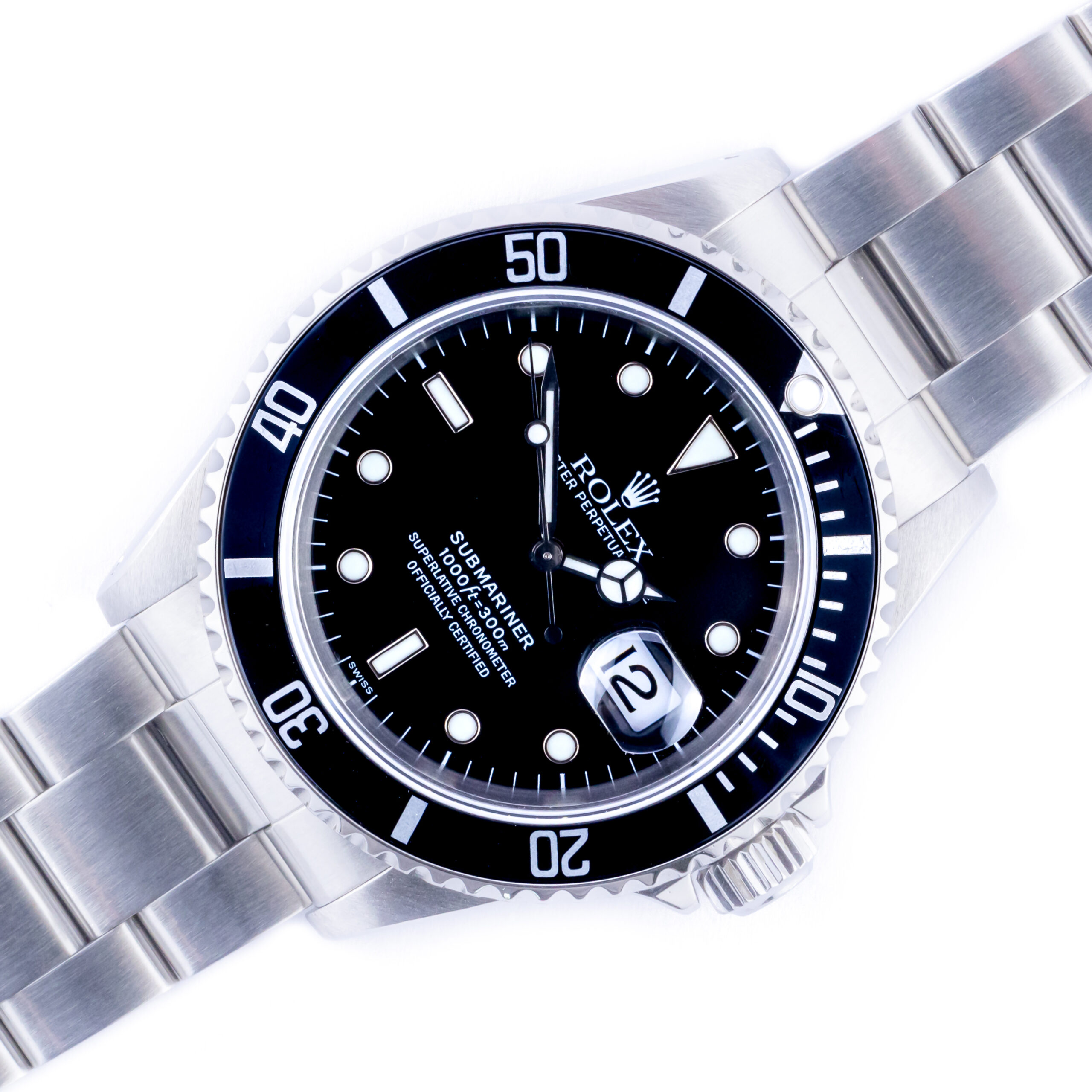 Rolex Oyster Perpetual Submariner Date Reference 16610 from 1999 including full set. The Submariner 16610 measures a 40mm stainless steel case, a stainless steel Oyster bracelet w/ Fliplock clasp and black rotatable bezel. The Submariner 16610 features an automatic caliber 3135 with quickset date function, a scratch resistance sapphire crystal and black dial with superluminova hands and markers.