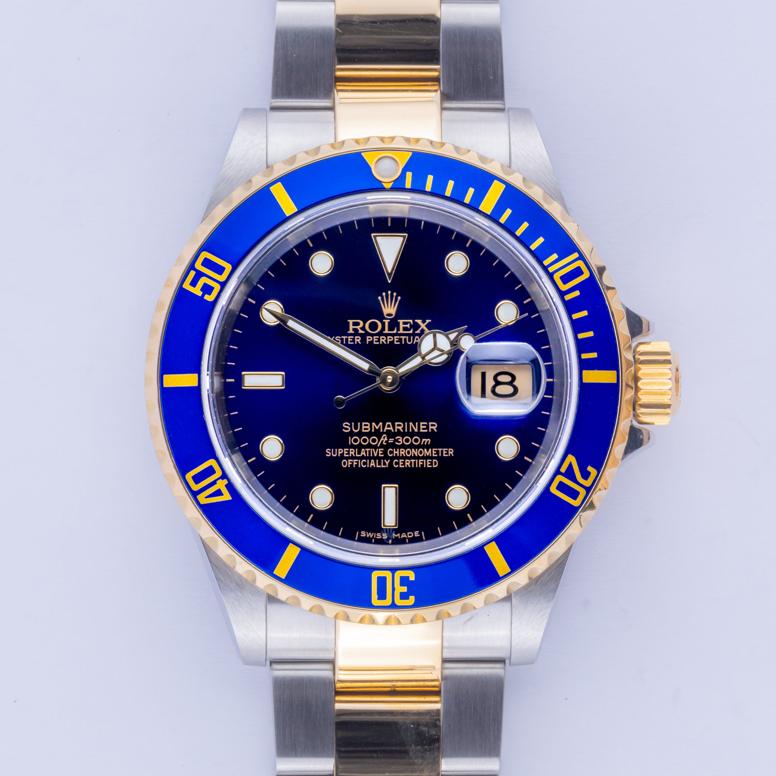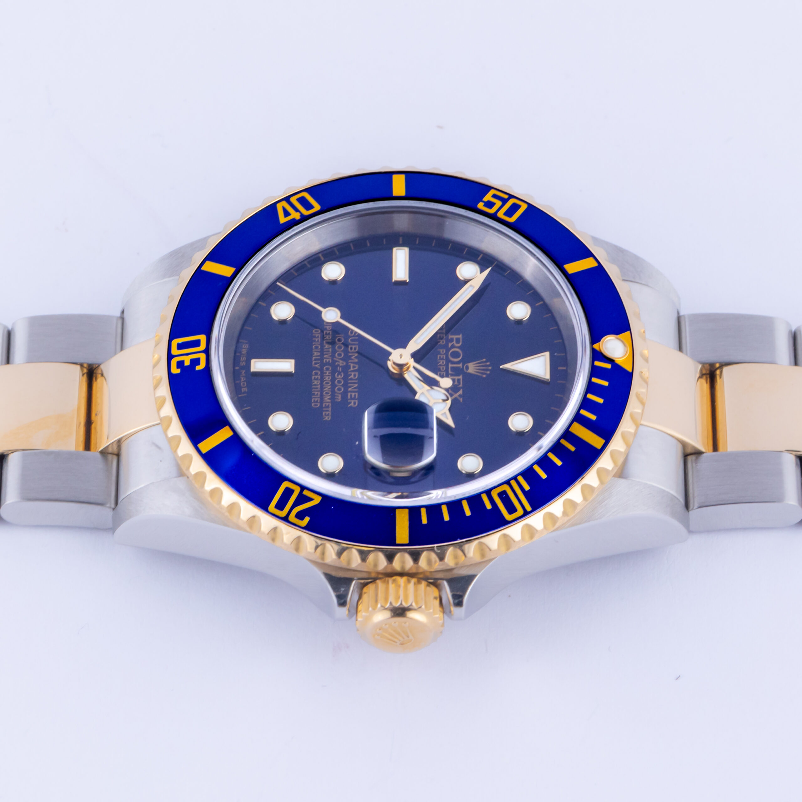 Rolex Oyster Perpetual Submariner Date Reference 16613 from 2007 including full set. The Submariner 16613 measures a 40mm stainless steel/gold case, a stainless steel/gold Oyster bracelet w/ Fliplock clasp and blue rotatable bezel. The Submariner 16613 features an automatic caliber 3135 with quickset date function, a scratch resistance sapphire crystal and blue dial with tritium hands and superluminova markers.
